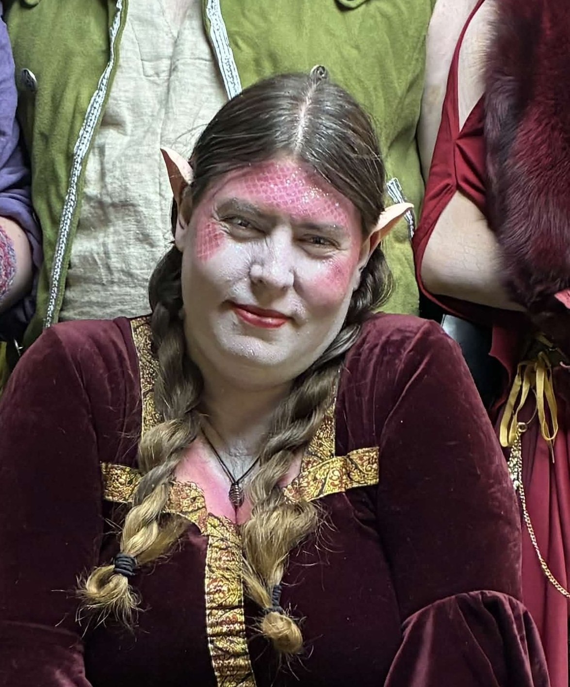 She provides all the home cooked meals for the game and helps with some of the logistics. She can be found in game as the NPC Tavern Keep, Telma Rumbleroot -