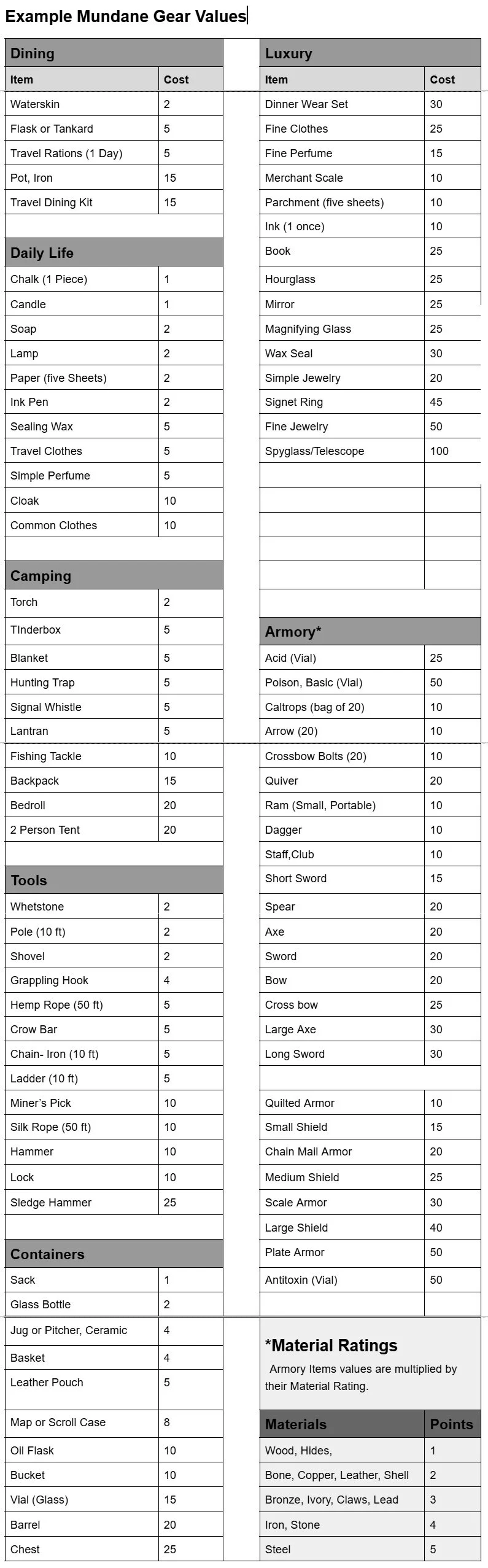 It is important to note again that most of the Discarded World is controlled by the Empire, a socialist society. Food staples, equipment for Imperial jobs, healthcare, lodging and education are provided by the Empire. This chart represents what one would expect to pay to buy more than the minimums that are provided by the empire, for luxury items, or for those outside the Empire trading with Imperial cities.